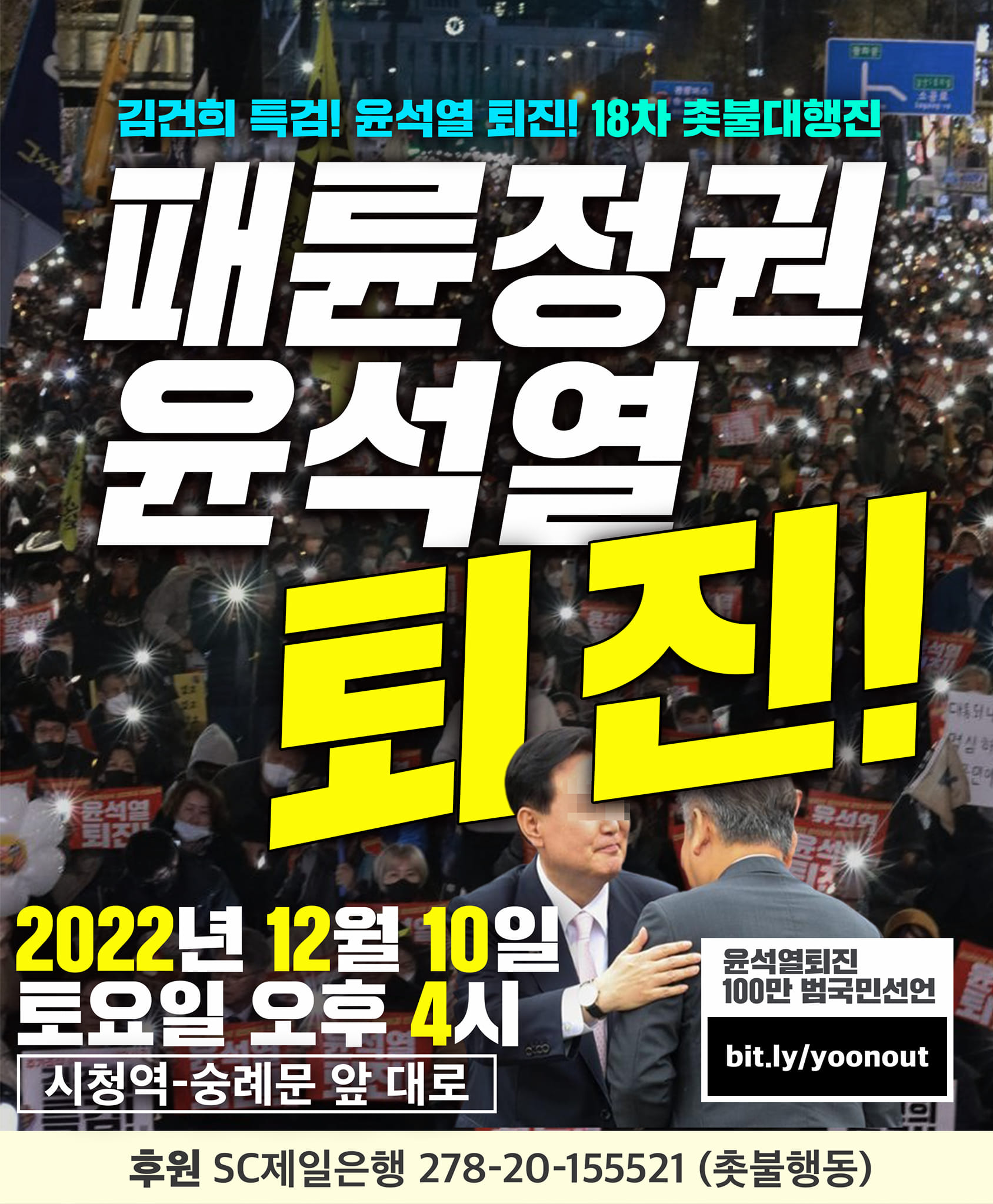 | 12월10일(토) 4시 시청역-숭례문 앞 대로 김건희 특검 윤석열 퇴진 18차 촛불대행진 집회 일정 (0) | 2022.12.09 |