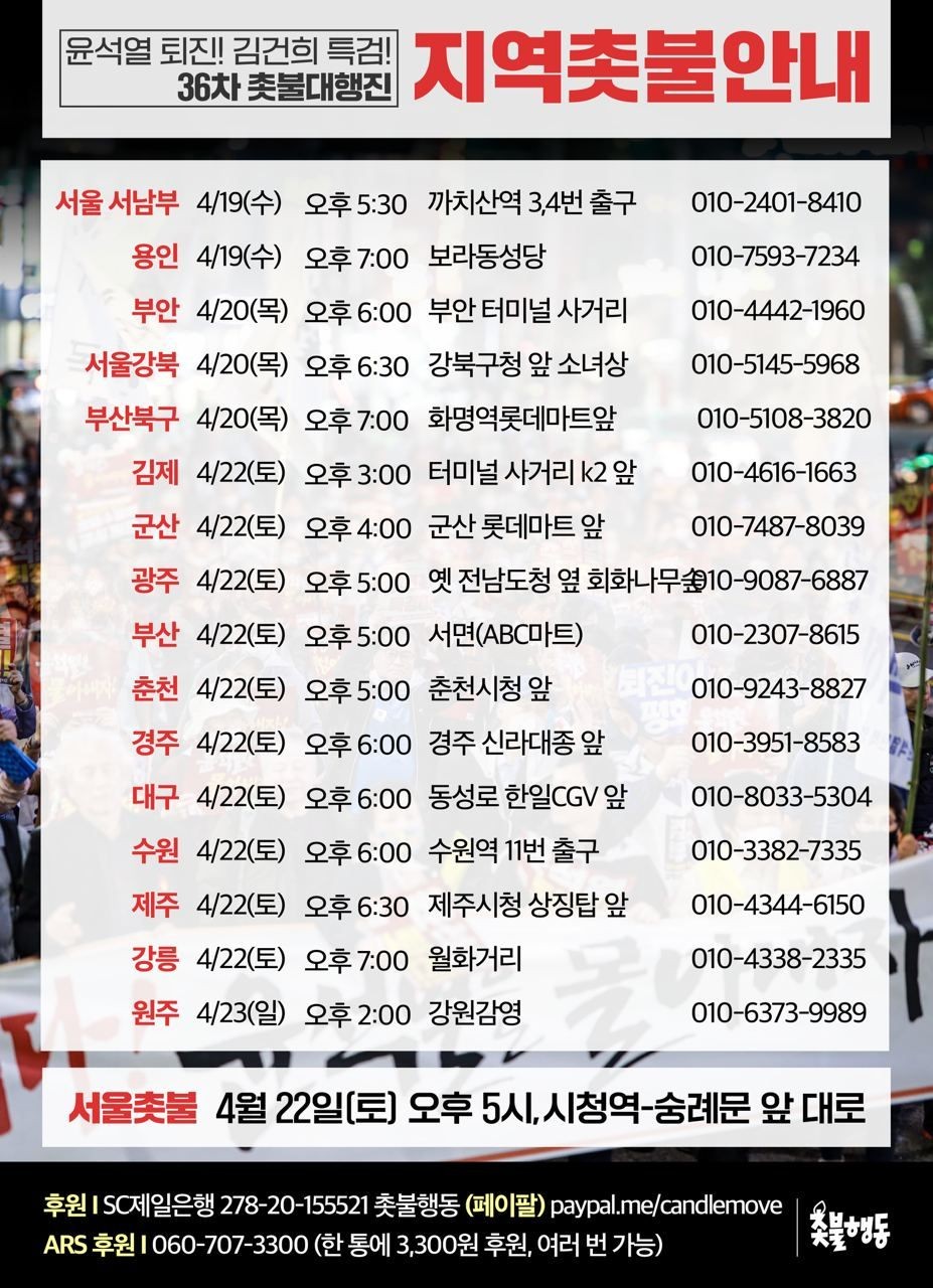 4월22일(토) 5시 시청역,숭례문 윤석열 퇴진, 김건희 특검 36차 촛불대행진
