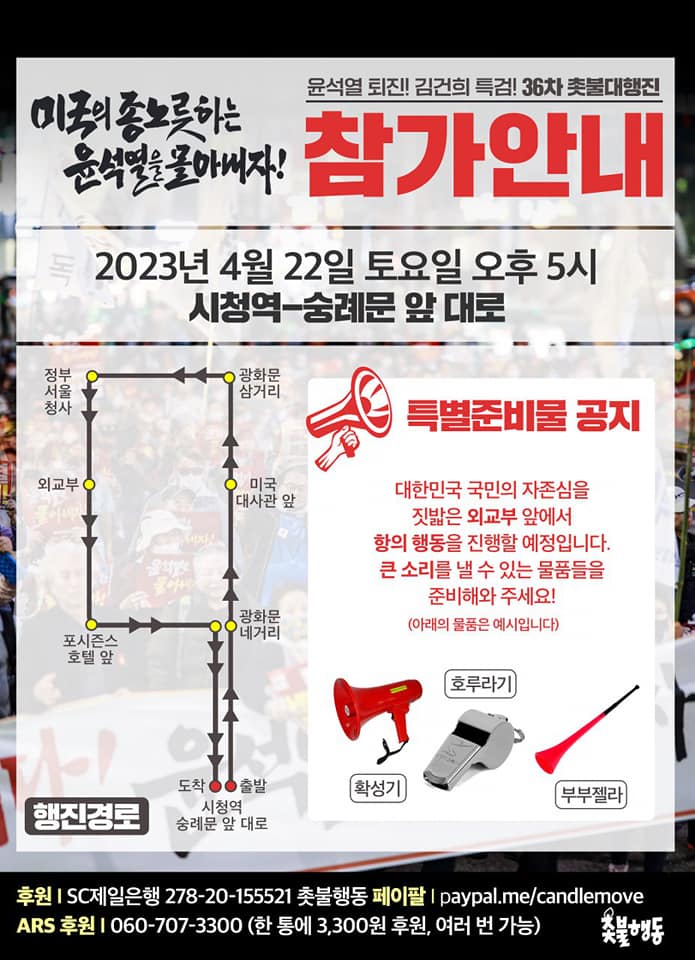 | 4월29일(토) 5시 시청역-숭례문 대로 윤석열 퇴진, 김건희 특검 37차 촛불대행진 (0) | 2023.04.24 |