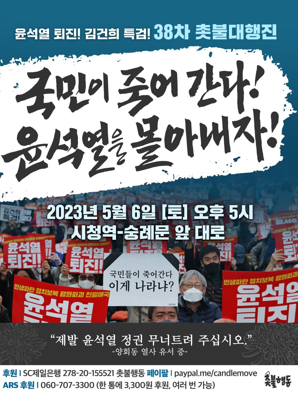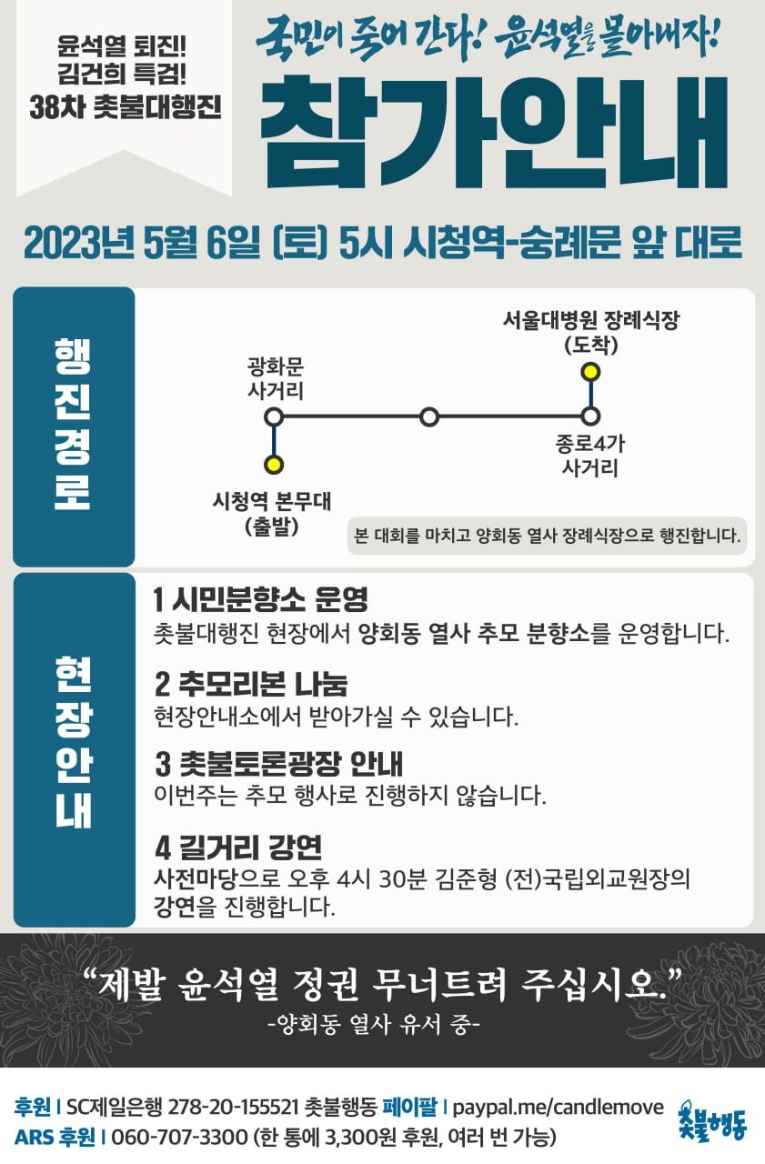 | 5월6일(토) 윤석열 퇴진, 김건희 특검 38차 촛불대행진 집회 일정 (0) | 2023.05.01 |