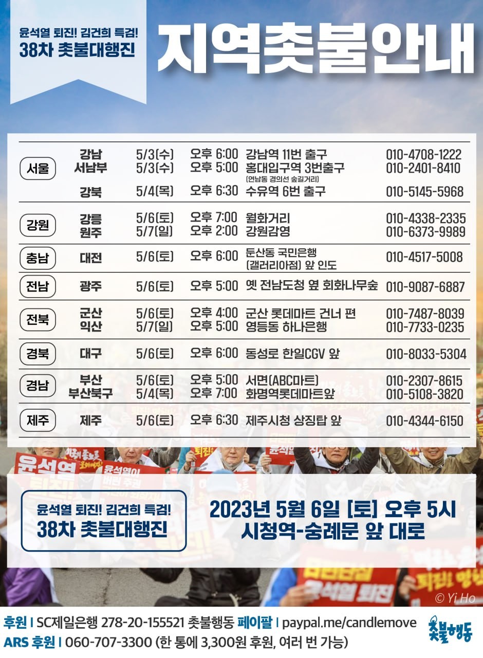 | 5월13일(토) 윤석열 퇴진, 김건희 특검 39차 촛불대행진 집회 전국 일정 (0) | 2023.05.07 |