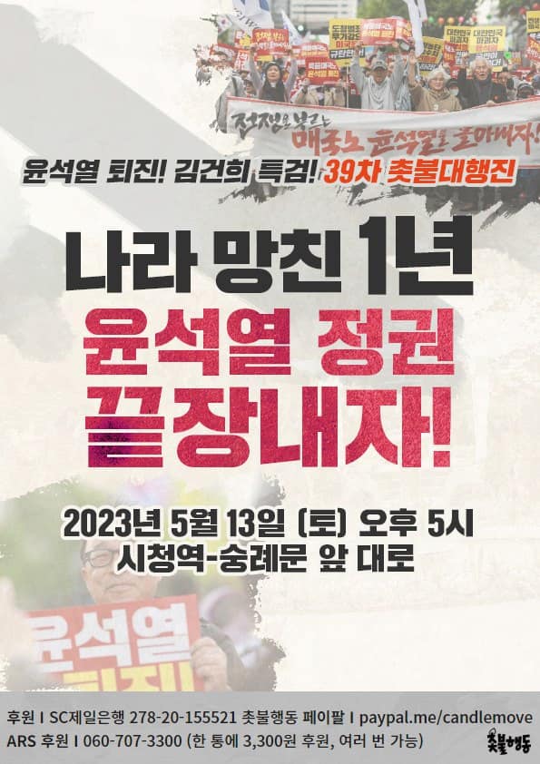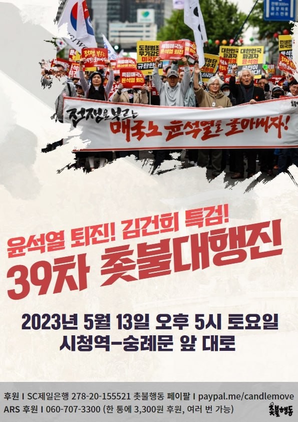 | 5월13일(토) 5시 시청역-숭례문대로 윤석열 퇴진, 김건희 특검 39차 촛불대행진 (0) | 2023.05.07 |