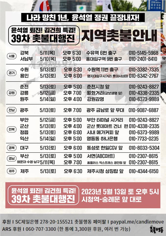 5월13일(토) 윤석열 퇴진, 김건희 특검 39차 촛불대행진 집회 전국 일정