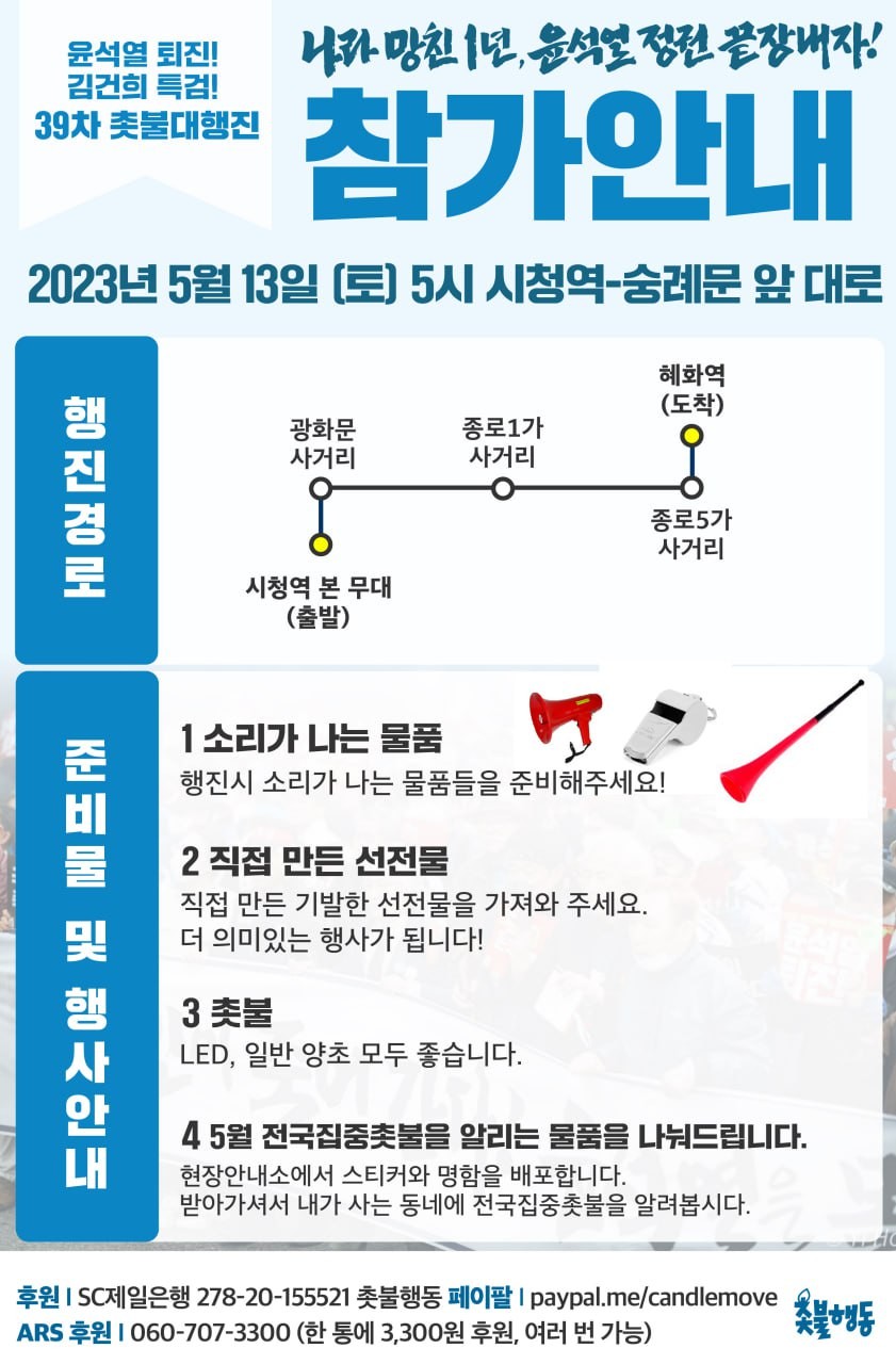 | 5월13일(토) 윤석열 퇴진, 김건희 특검 39차 촛불대행진 집회 전국 일정 (0) | 2023.05.07 |