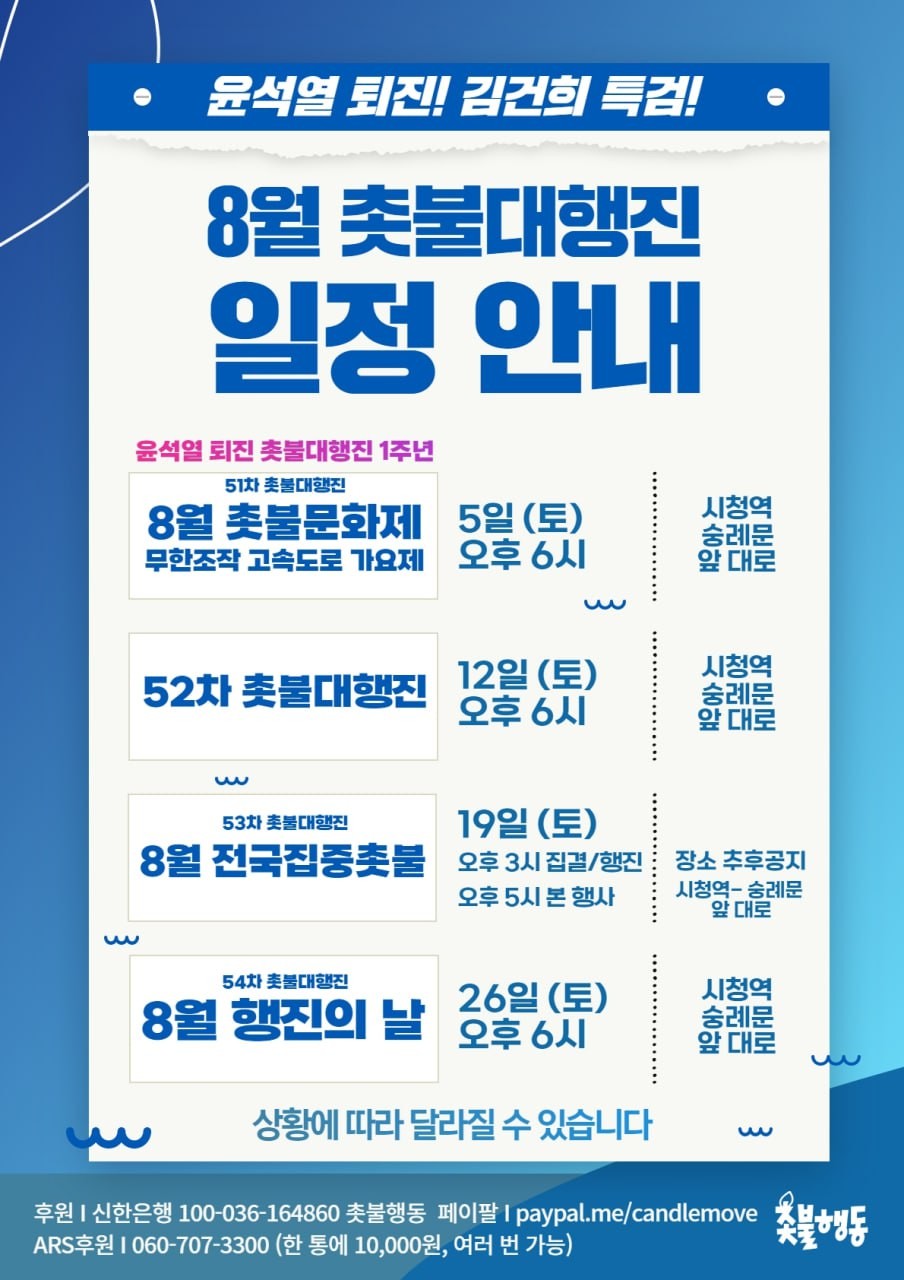 8월5일(토) 6시 시청역 - 숭례문 앞 대로 51차 윤석열 퇴진 촛불대행진 https://tadream.tistory.com/35360