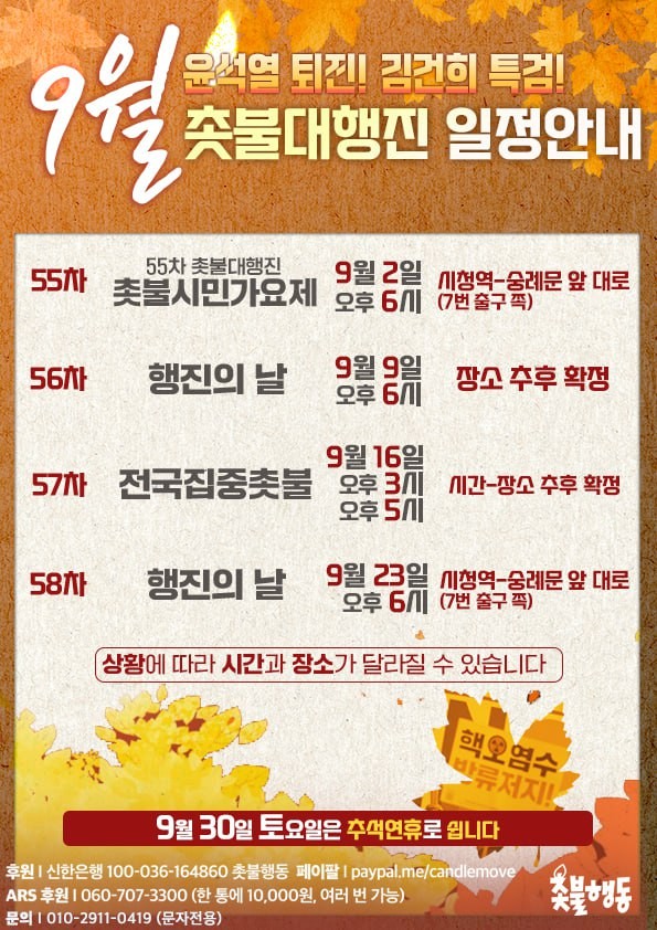 9월16일(토) 3시 장소미정 / 5시 시청역-숭례문 앞 대로 57차 촛불대행진 : 9월 전국집중 촛불