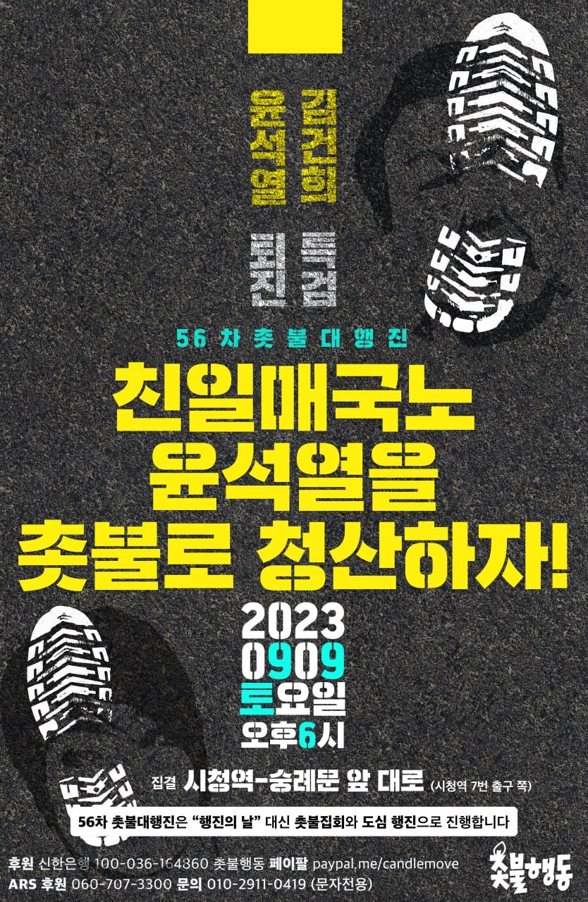 | 9월23일(토) 윤석열 퇴진, 김건희 특검 58차 촛불대행진 집회 일정 (1) | 2023.09.19 |