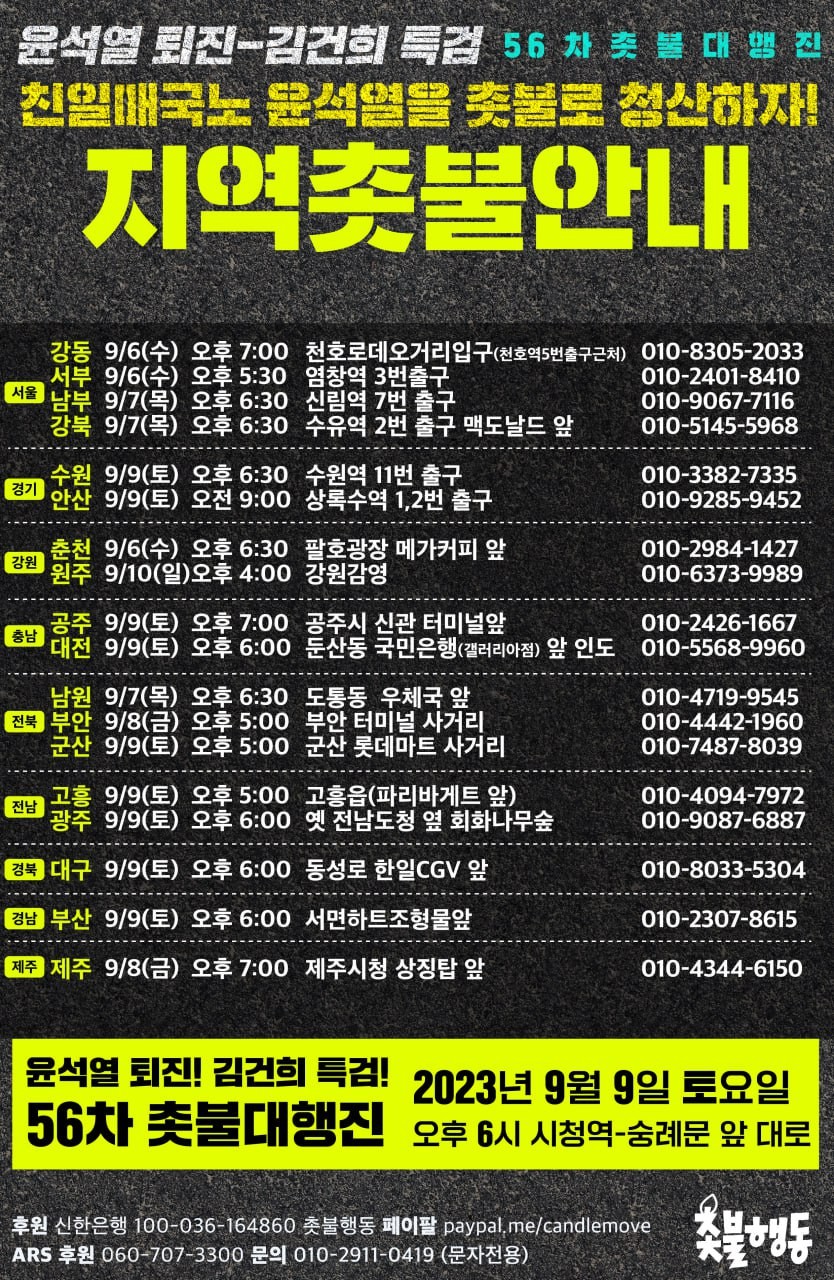 | 9월16일(토) 윤석열 퇴진, 김건희 특검 9월 전국집중 57차 촛불대행진 집회 일정 (0) | 2023.09.10 |