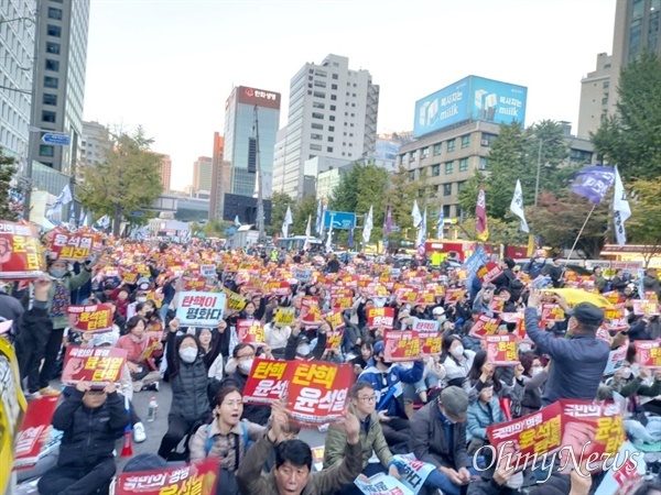 이날 본 집회가 열린 숭례문 앞부터 서울광장까지 이어진 도로를 가득 메운 시민들은 "범국민 항쟁으로 윤석열을 몰아내자", "국민의 명령이다 윤석열을 탄핵하라"고 외쳤다.