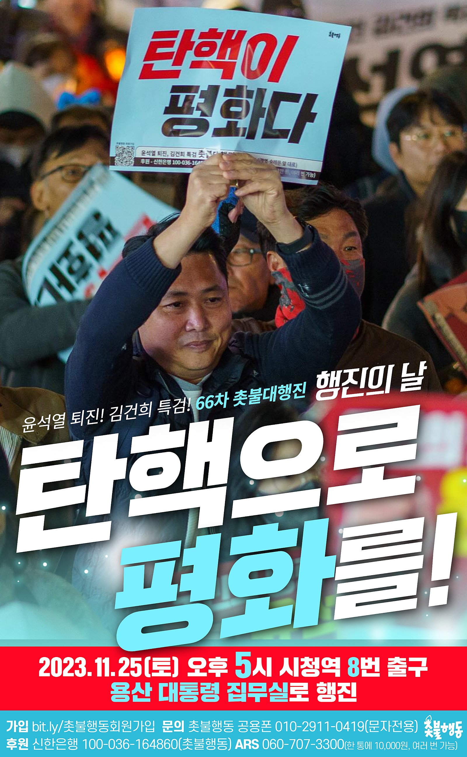 | 11월18일(토) 윤석열 퇴진, 김건희 특검 11월 전국집중 65차 촛불 대행진 집회 일정 (0) | 2023.11.12 |