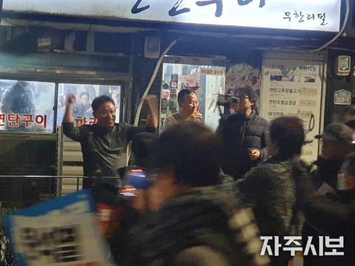 이를 막기 위해 풍물패와 나팔 부대가 앞에서 계속 풍물을 치고 나팔을 불었다.