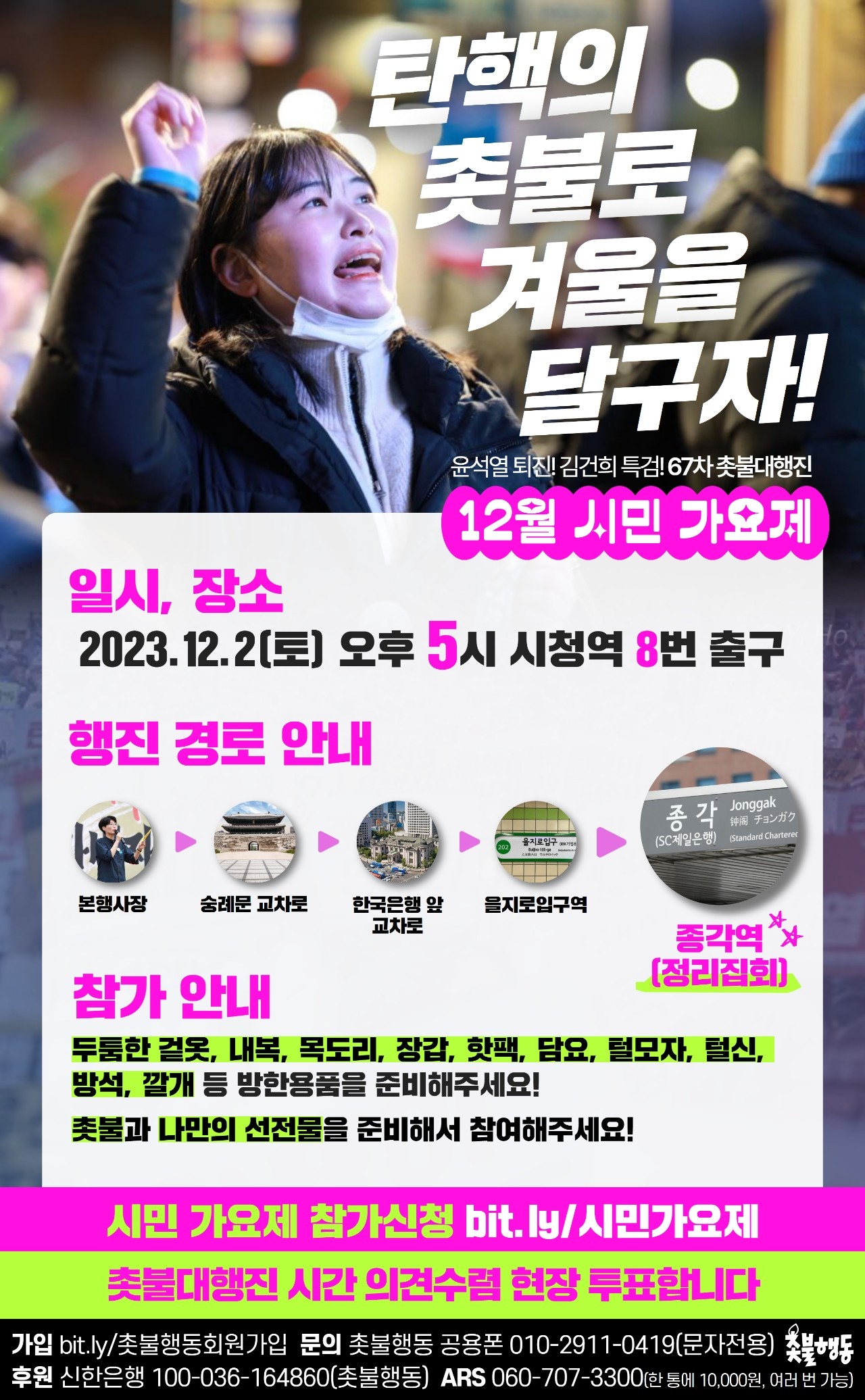 서울 12뭘2일(토) 5시 시청역-숭례문 앞 대로 (시청역 8번 출구) 윤석열퇴진, 김건희 특검 67차 촛불대행진