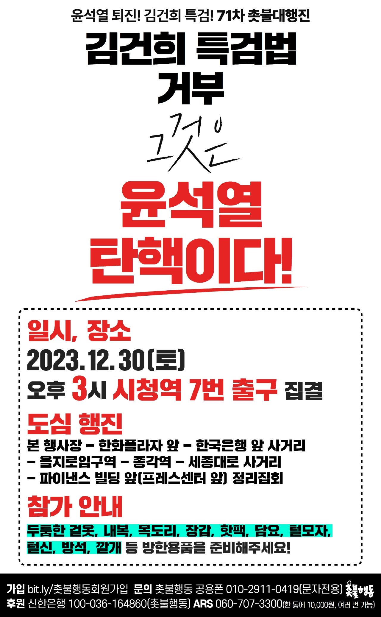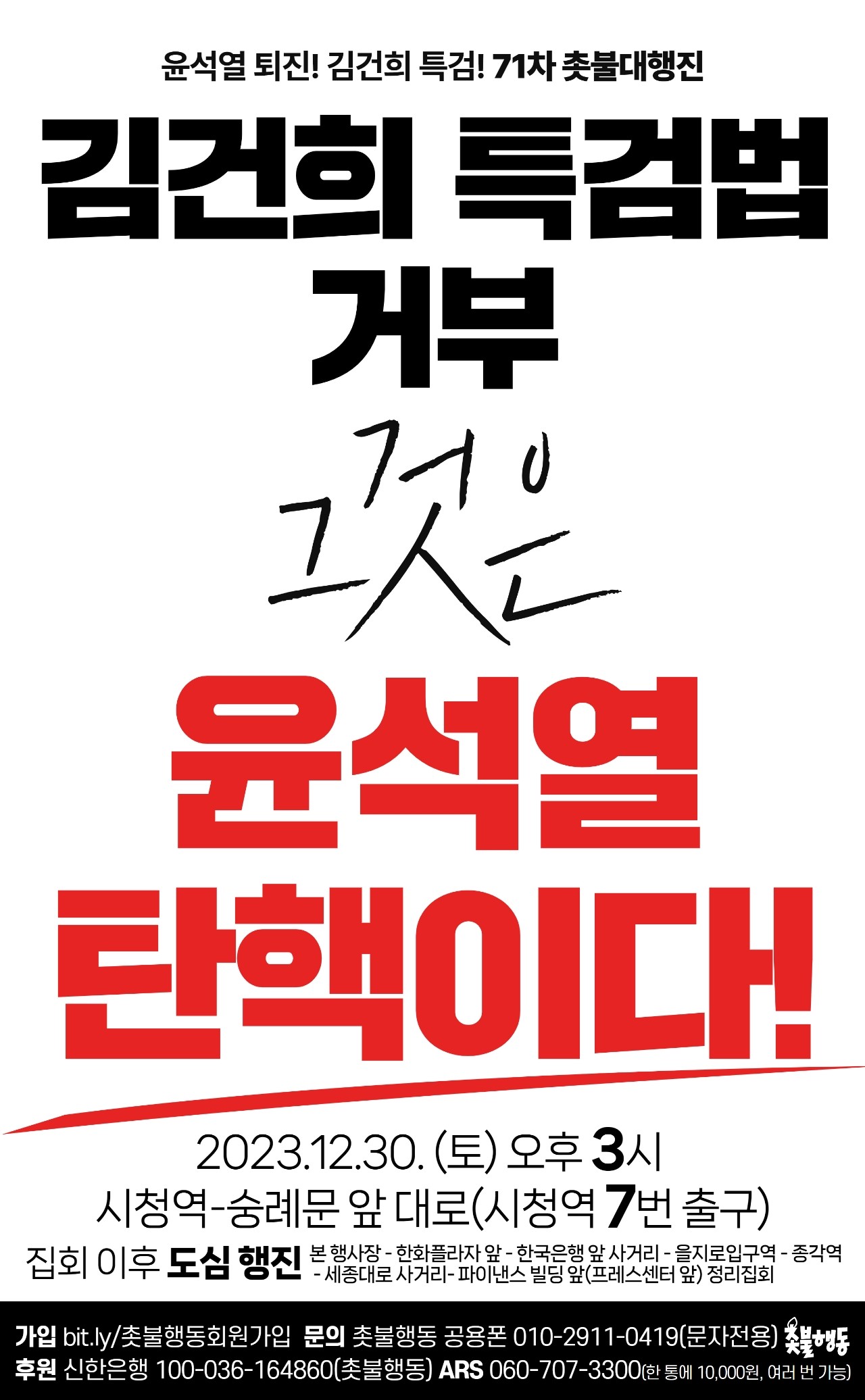 12월30일(토) 윤석열 퇴진, 김건희 특검 71차 촛불대행진 집회 일정