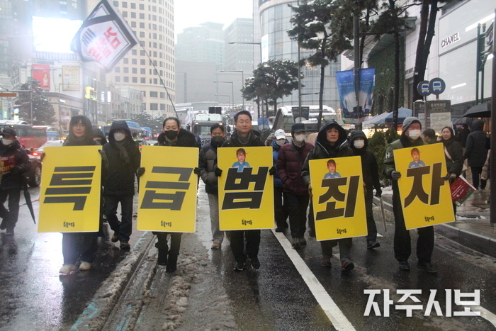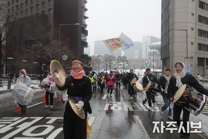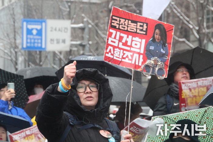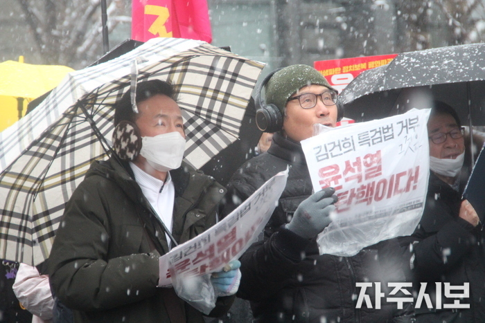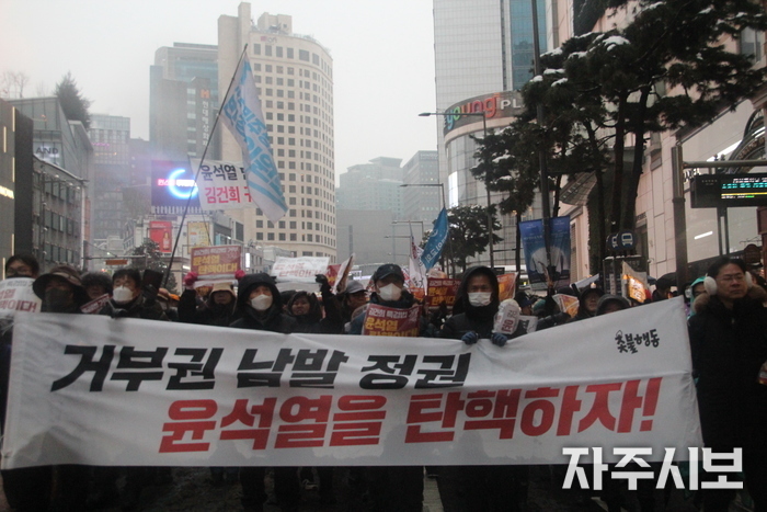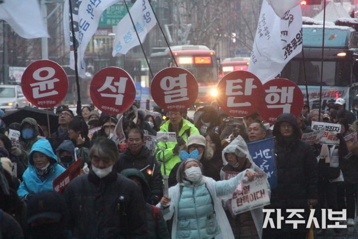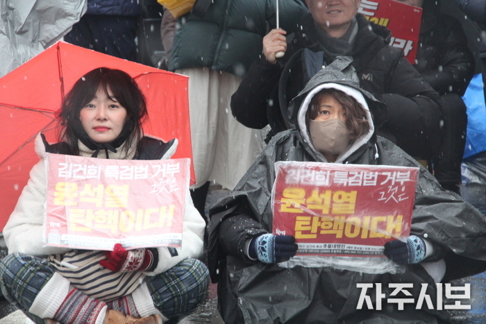 ‘김건희 특검 거부하면 탄핵’을 부제로 내건 ‘윤석열 퇴진! 김건희 특검! 71차 촛불대행진’에는 쏟아지는 진눈깨비를 무릅쓰고 연인원 5천 명이 모였다.