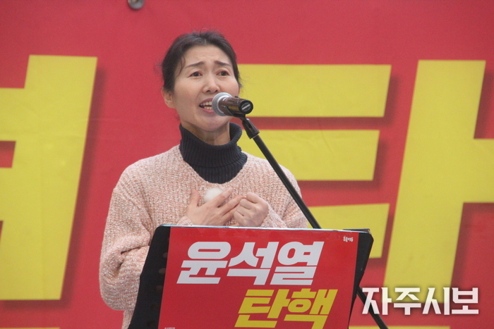사회자인 김지선 서울촛불행동 공동대표가 이날 중심 구호를 연속으로 외쳤다.