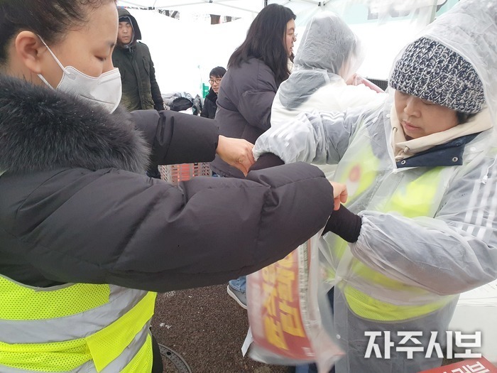 ▲ 눈에 젖지 않게 선전물을 비닐로 포장하고 있다. © 이인선 기자