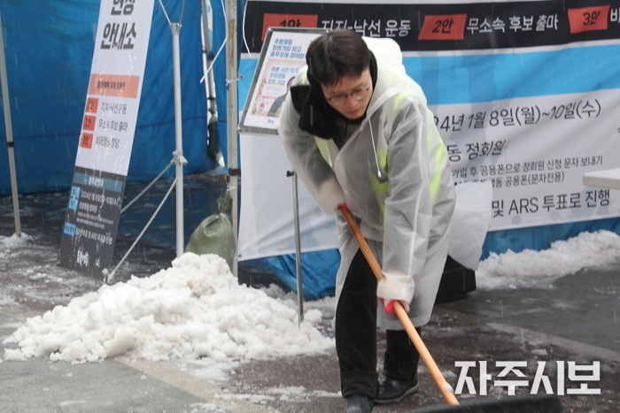 ▲ 집회장의 눈을 치우는 모습. © 김영란 기자