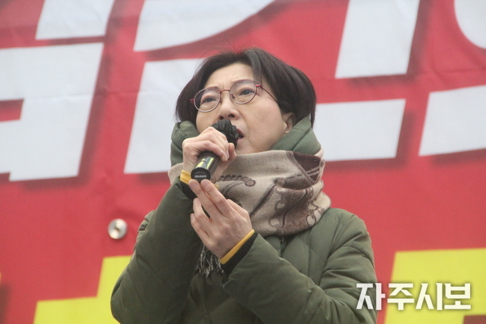 ▲ 구호를 외치는 김지선 서울촛불행동 공동대표. © 김영란 기자