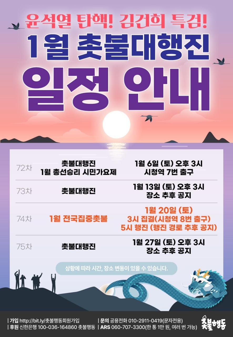 1월20일(토) 윤석열 퇴진 김건희 특검 1월 전국집중 74차 촛불 대행진 집회 일정 https://tadream.tistory.com/35505