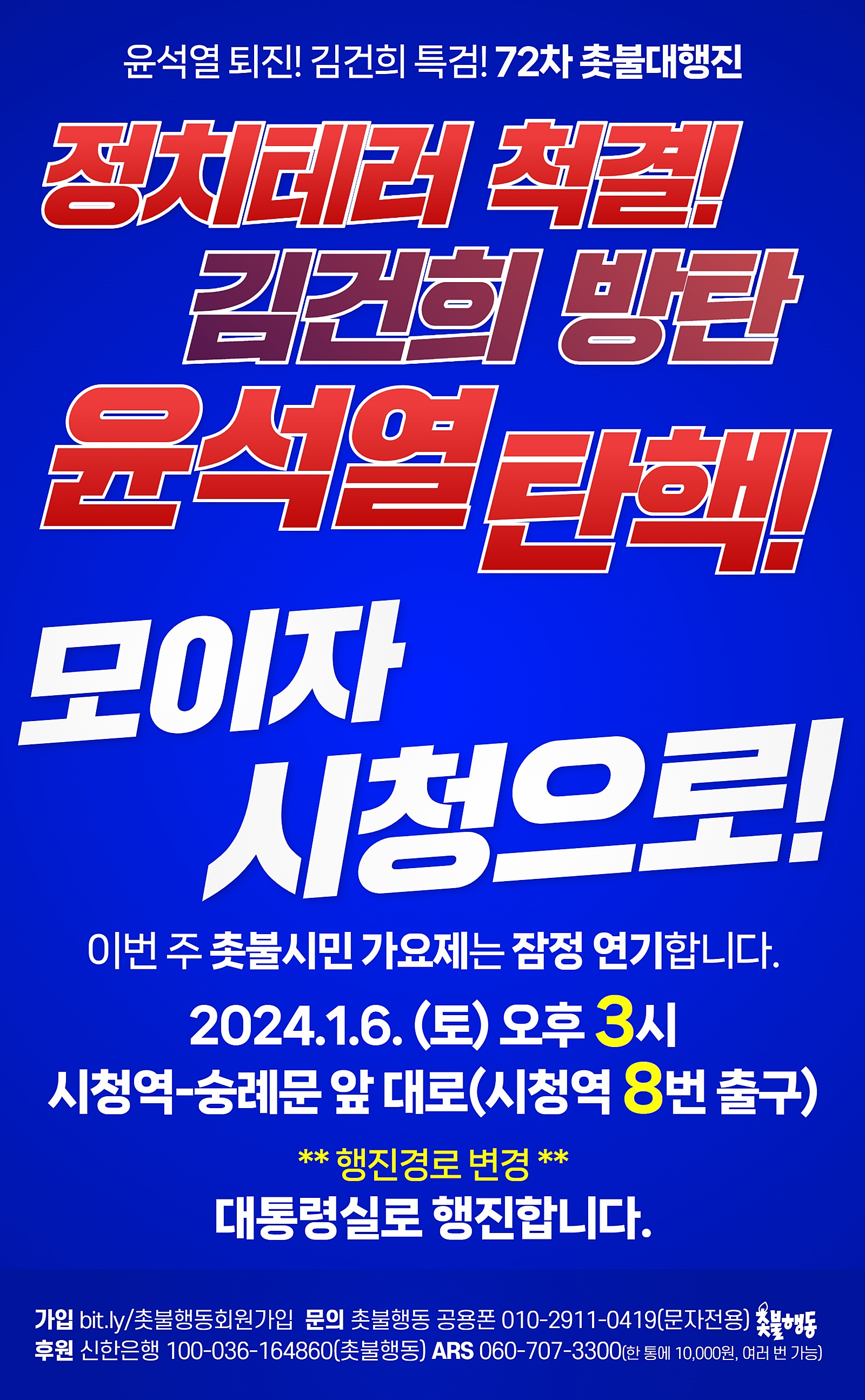 1월6일(토) 윤석열 퇴진, 김건희 특검 72차 촛불대행진 집회 일정