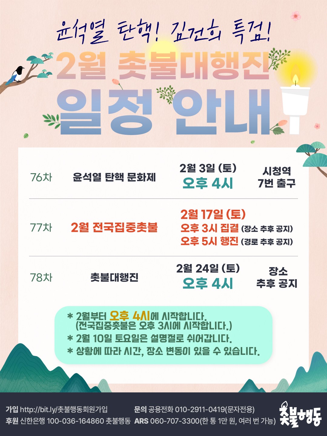 2월3일(토) 윤석열 퇴진, 김건희 특검 76차 촛불대행진 집회 일정 https://tadream.tistory.com/35515