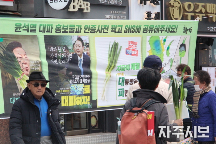 이날 참가자들은 윤석열 대통령과 총선 국힘당 후보들이 일으킨 ‘대파 논란’을 상징하는 대파를 손에 들고 진풍경을 연출했다.