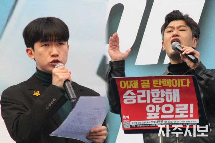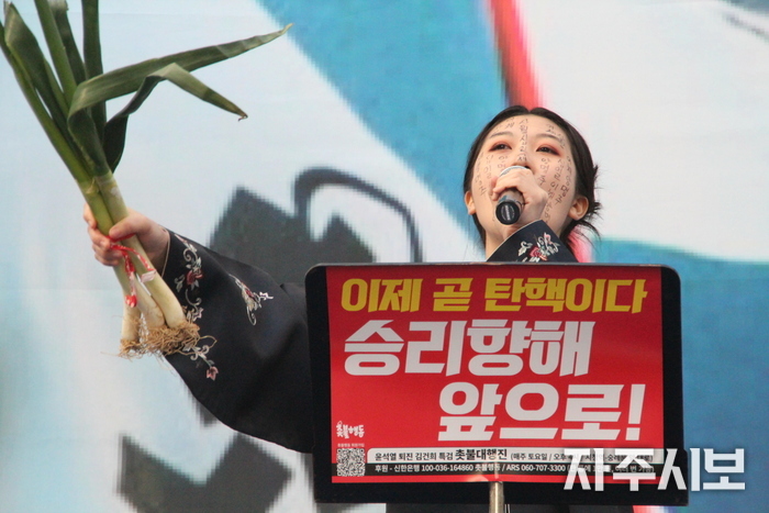 예술인 촛불행동 ‘촛불같이’의 류성 대표는 “자중지란에 빠진 윤석열 일당, 지금 화가 나고 당황해서 제정신이 아니다. 정치를 개 같이 한다고 막말을 하고 파 한 단이 아니라 한 뿌리라며 헛소리를 하고 있다”라고 소개한 뒤 “야당 대표의 유세장에서 회칼 2개를 들고 다니던 사람이 검거됐다. 이런 테러가 또 발생할 수 있다”라고 주장했다.