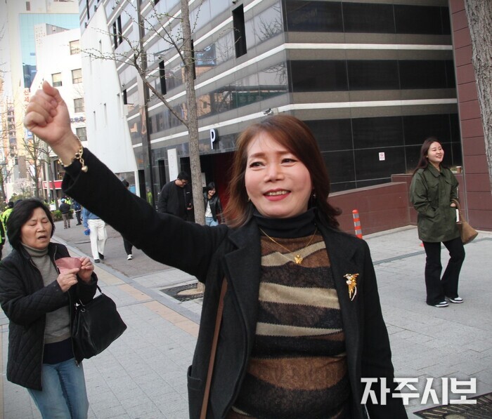 ▲ 한 시민이 행진대열을 응원하고 있다. © 김영란 기자