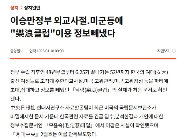 ▲ <중앙일보> 1995년 1월 18일 자 기사 '이승만정부 외교사절, 미군 등에 낙랑클럽 이용 정보 빼냈다' ⓒ 중앙일보 홈페이지 캡처