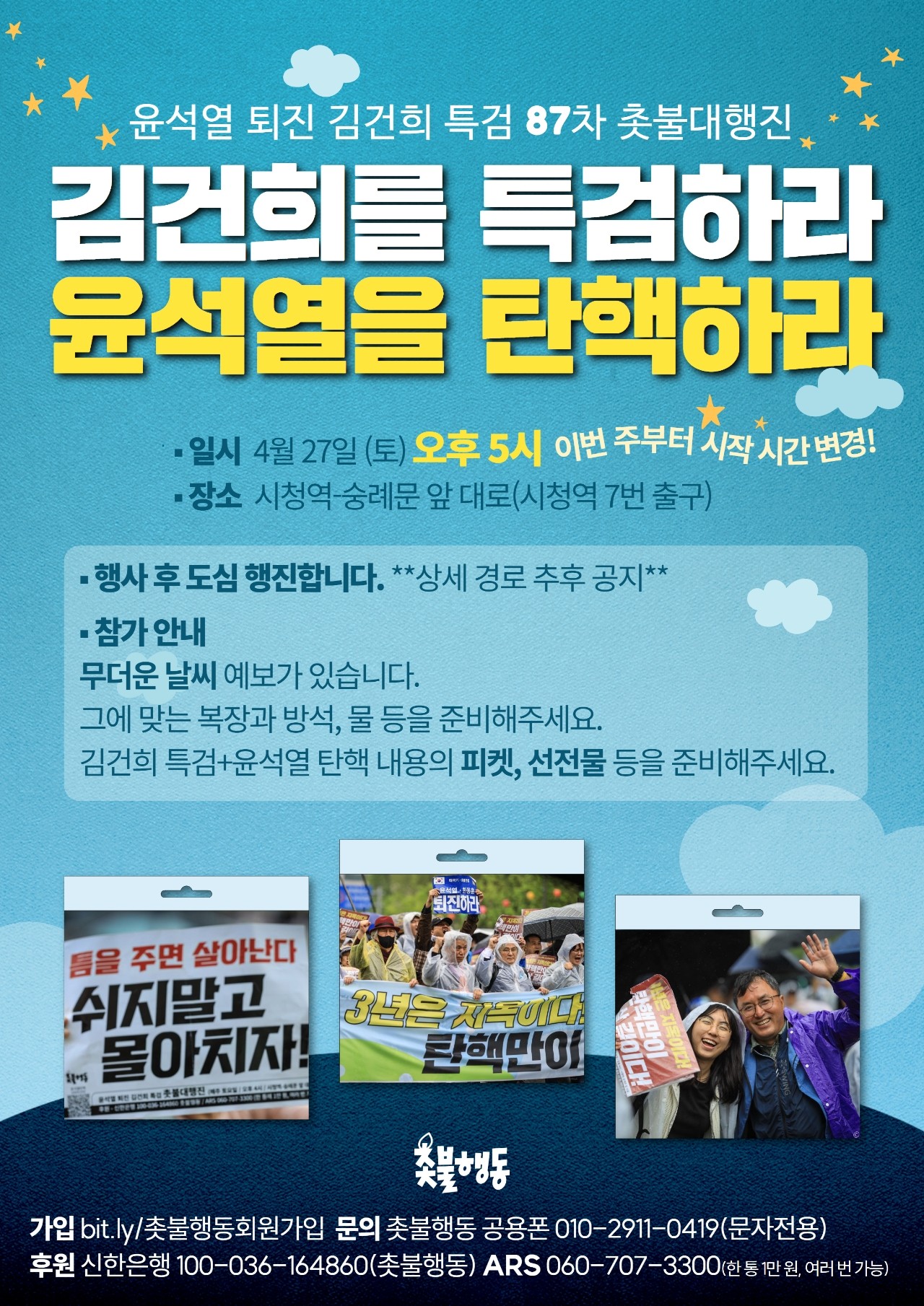 4월27일(토) 윤석열 퇴진 김건희 특검 87차 촛불대행진 집회 일정