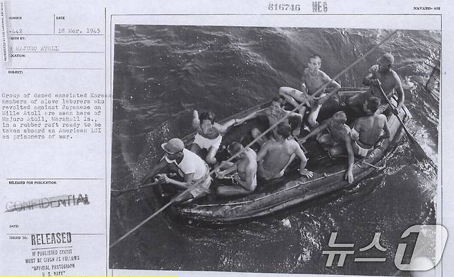 태평양 마셜 제도 '밀리환초'에서 강제노역에 시달렸던 한국인 노동자들이 미군 배에 의해 구출되는 모습.(국사편찬위원회 제공) 2024.6.4/뉴스1