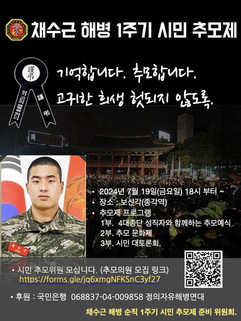 서울 7월19일(금) 6시 보신각(종각역) 채수근 해병 순직 1주기 추모제