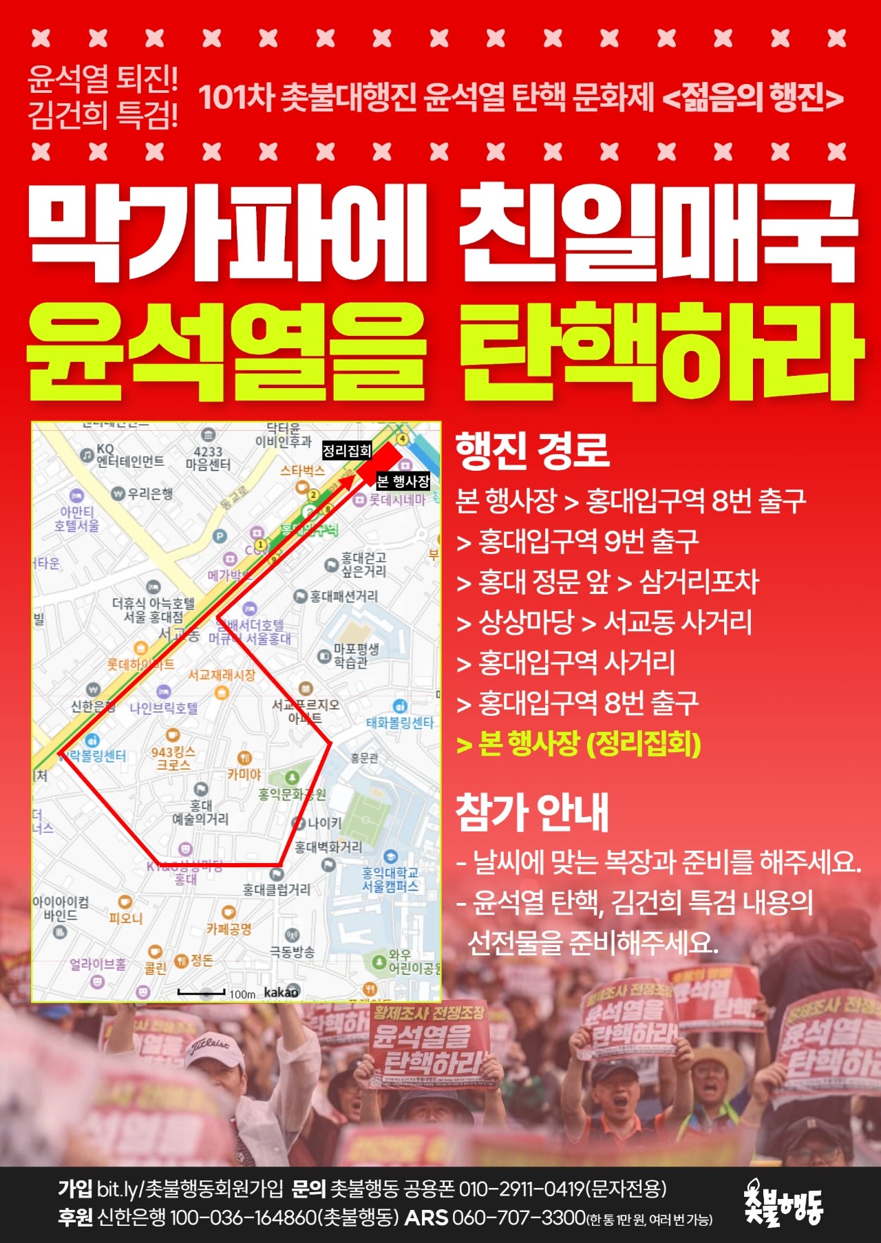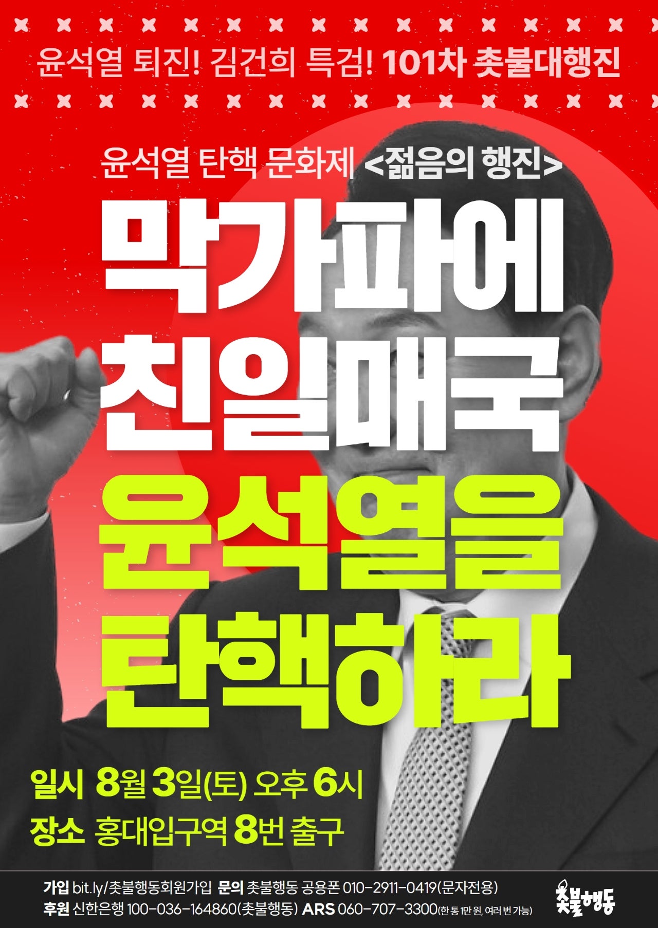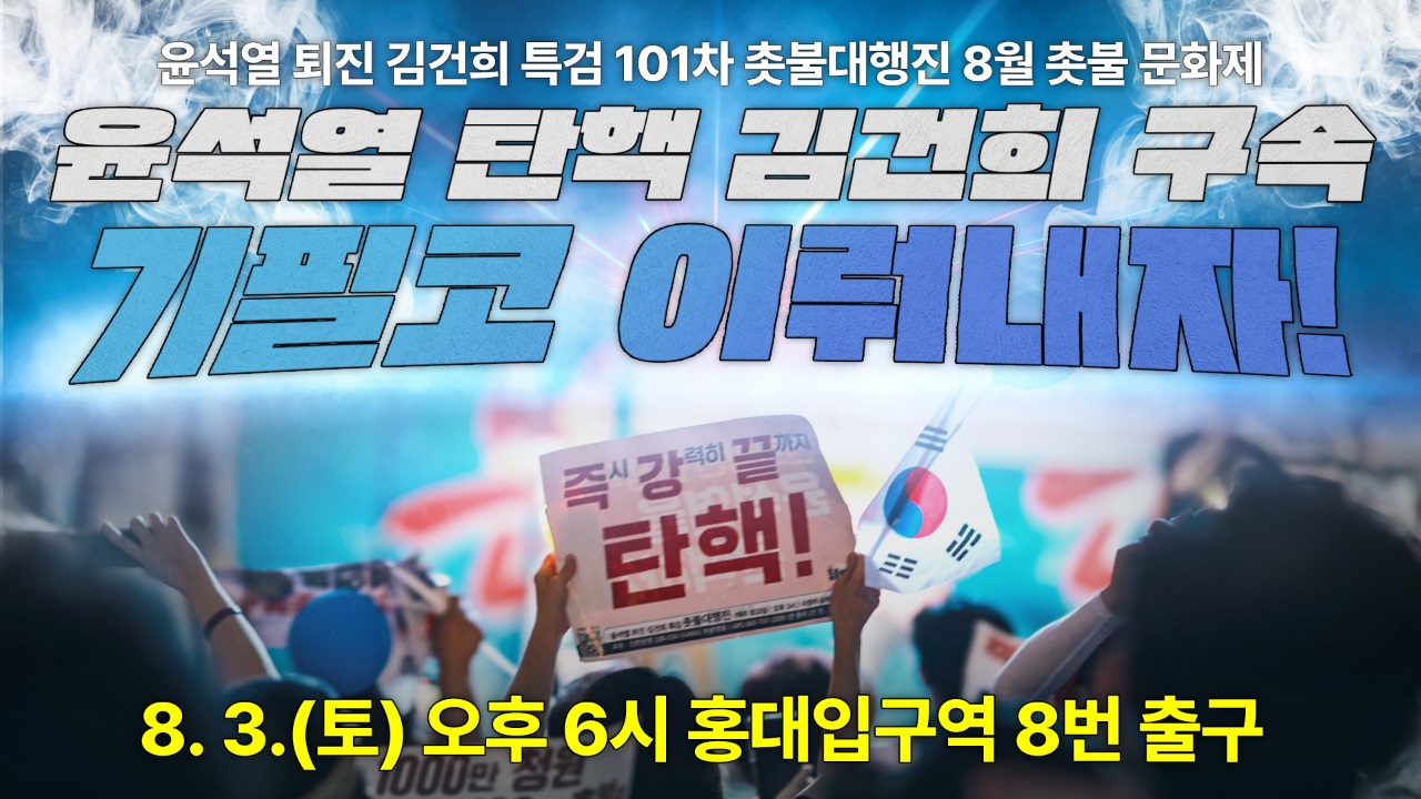 서울 8월3일(토) 6시 홍대입구역 8번 출구 윤석열 퇴진 김건희 특검 101차 촛불대행진 탄핵문화제 --> 장소 유의