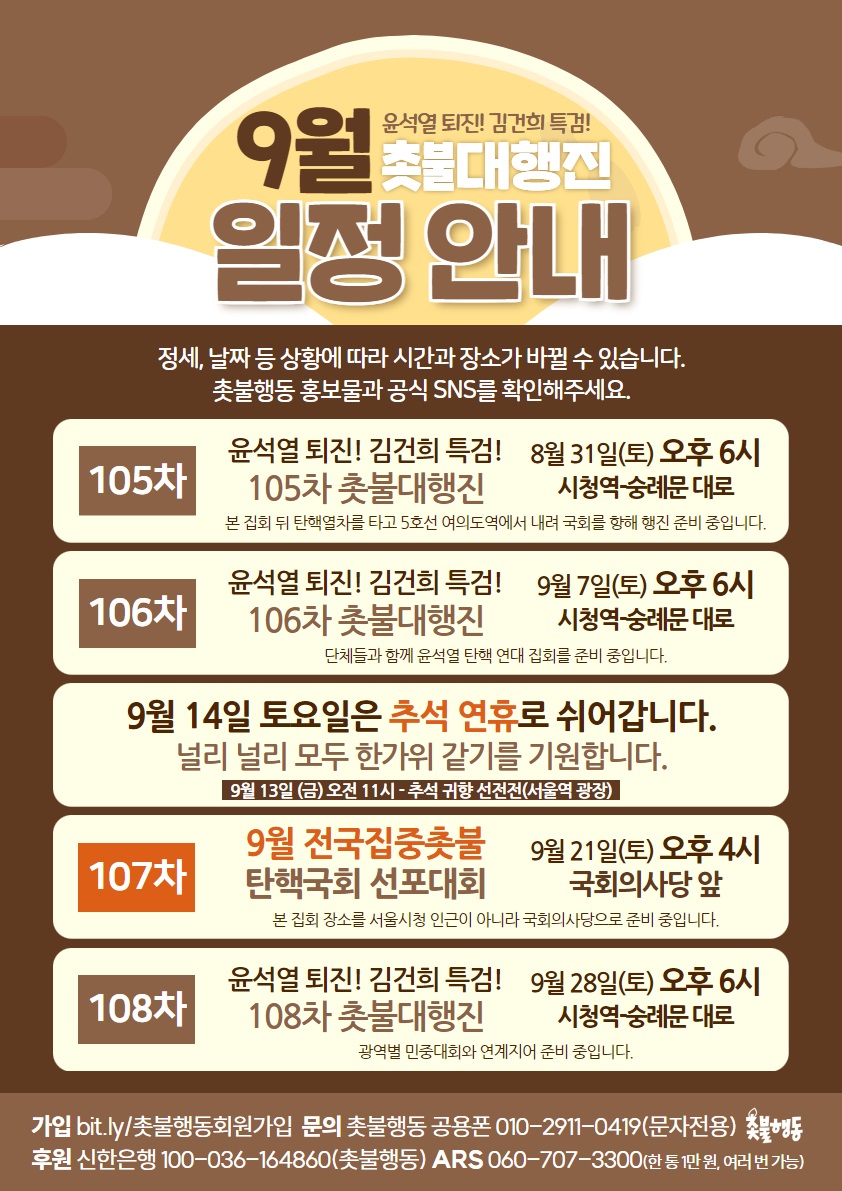 9월21일(토) 윤석열 퇴진 김건희 특검 9월 전국집중 107차 촛불 대행진 집회 일정 https://tadream.tistory.com/35808