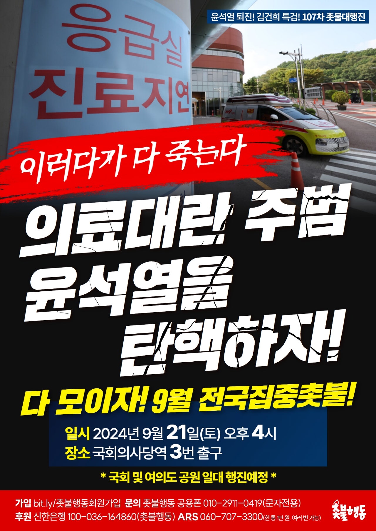 서울 9월21일(토) 4시 국회의사당역 3번 출구 윤석열 퇴진 김건희 특검 9월 전국집중촛불 107차 촛불대행진