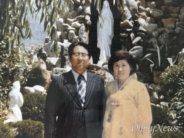 ▲ 1970년대 말 신림동 인근 천주교 성당 앞에서 사진을 찍은 방자명 부부. ⓒ 김화빈