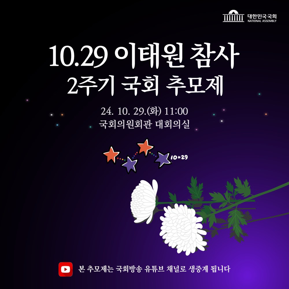 서울 여의도 10월29일(화) 오전 11시 국회 의원회관 대회의실 10.29 이태원 참사 2주기 진실과 기억 추모식