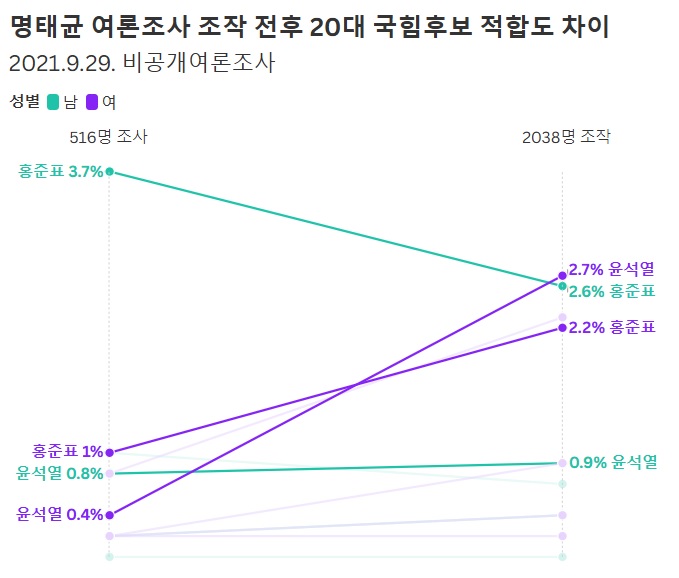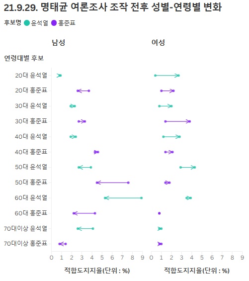 명태균씨는 21년 9월 29일 여론조사를 516명에서 2000명으로 조작지시했다. 위 그래프는 조작전후 성별-연령별 윤석열, 홍준표 두 후보의 적합도 지지율 차이를 보여준다. 화살표가 가리키는 점이 조작후 데이터로, 조작후에 50대 이상 남성의 지지는 줄어들고, 50대 이하 여성의 지지는 높이는 방식으로 조작했다. 위 수치는 516명 조작전 데이터와 2038명 조작후 데이터로 최종보고서 수치와는 약간의 차이가 있다.