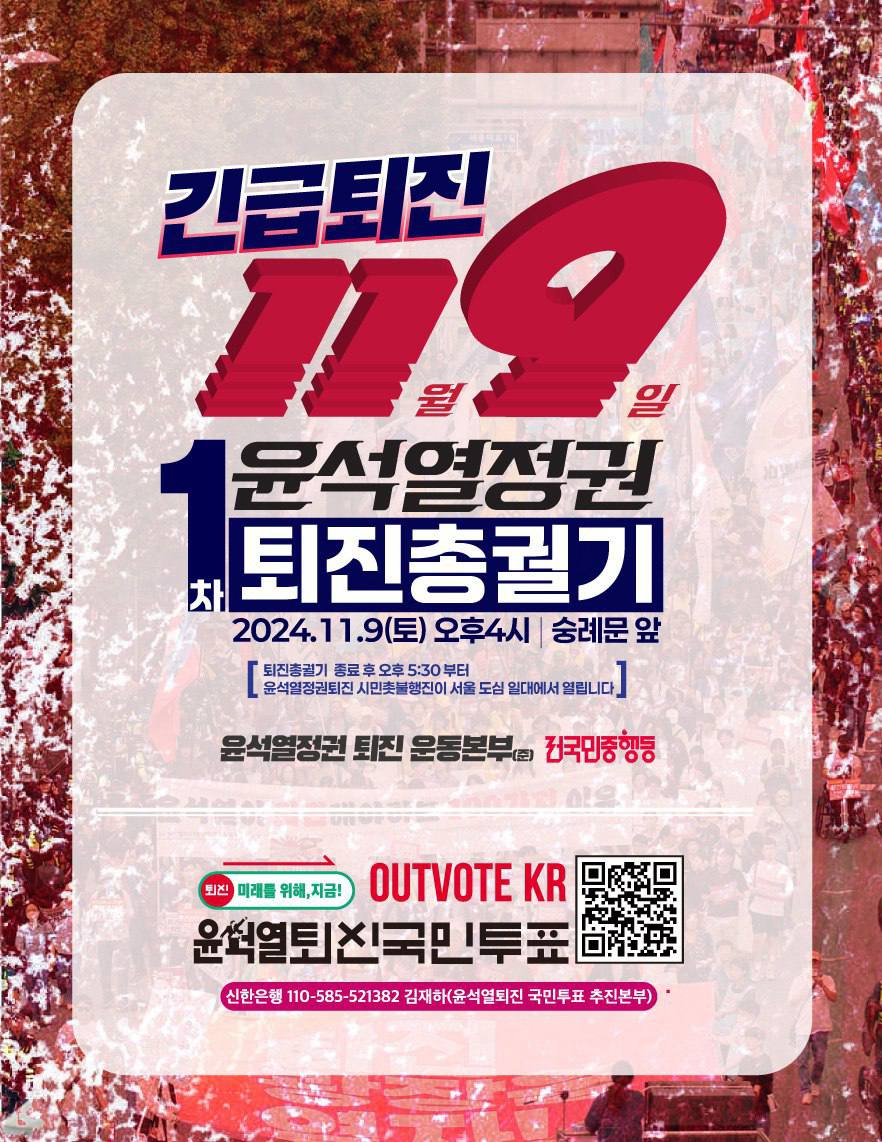 | 11월9일(토) 4시 숭례문 앞 1차 윤석열 정권 퇴진 총궐기 (0) | 2024.11.07 |