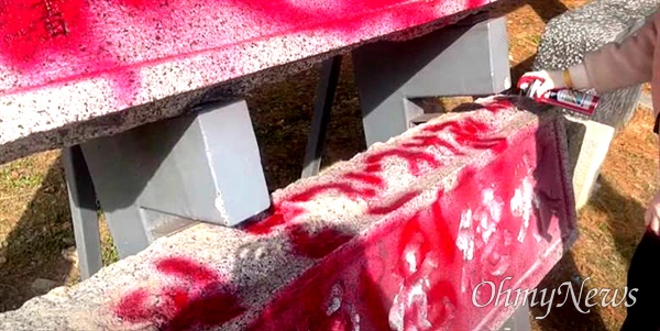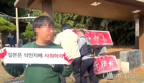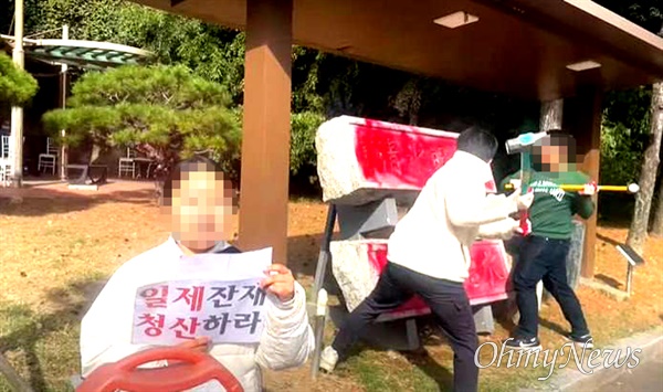 대학생 3명은 "일제 잔재 청산하라"는 손팻말을 들고 석물에 붉은 색칠을 한 뒤 망치로 일부 글자를 뭉개는 행동을 했다.