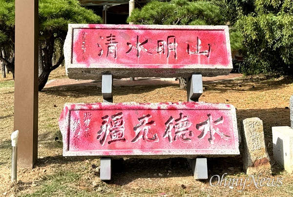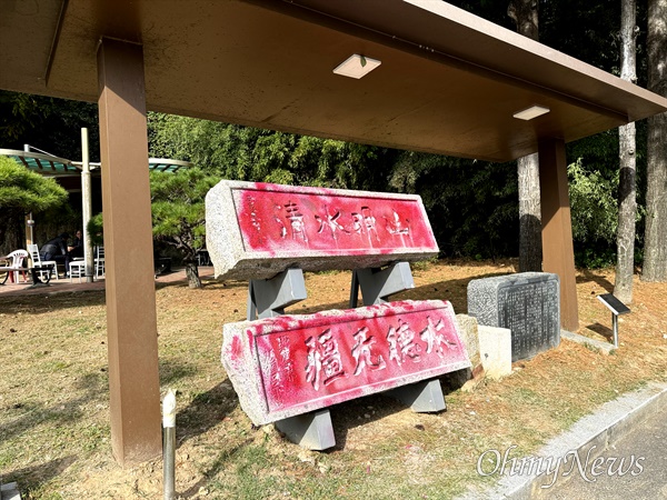 창원시립 마산박물관 주차장 옆 화단에 유독 돋보이게 해 전시해 놓은 일제강점기 조선총독‧마산부윤(시장)의 글씨가 새겨진 석물(석각, 금석문)에 대학생들이 붉은 색칠을 하고 일부 글자를 훼손했다.