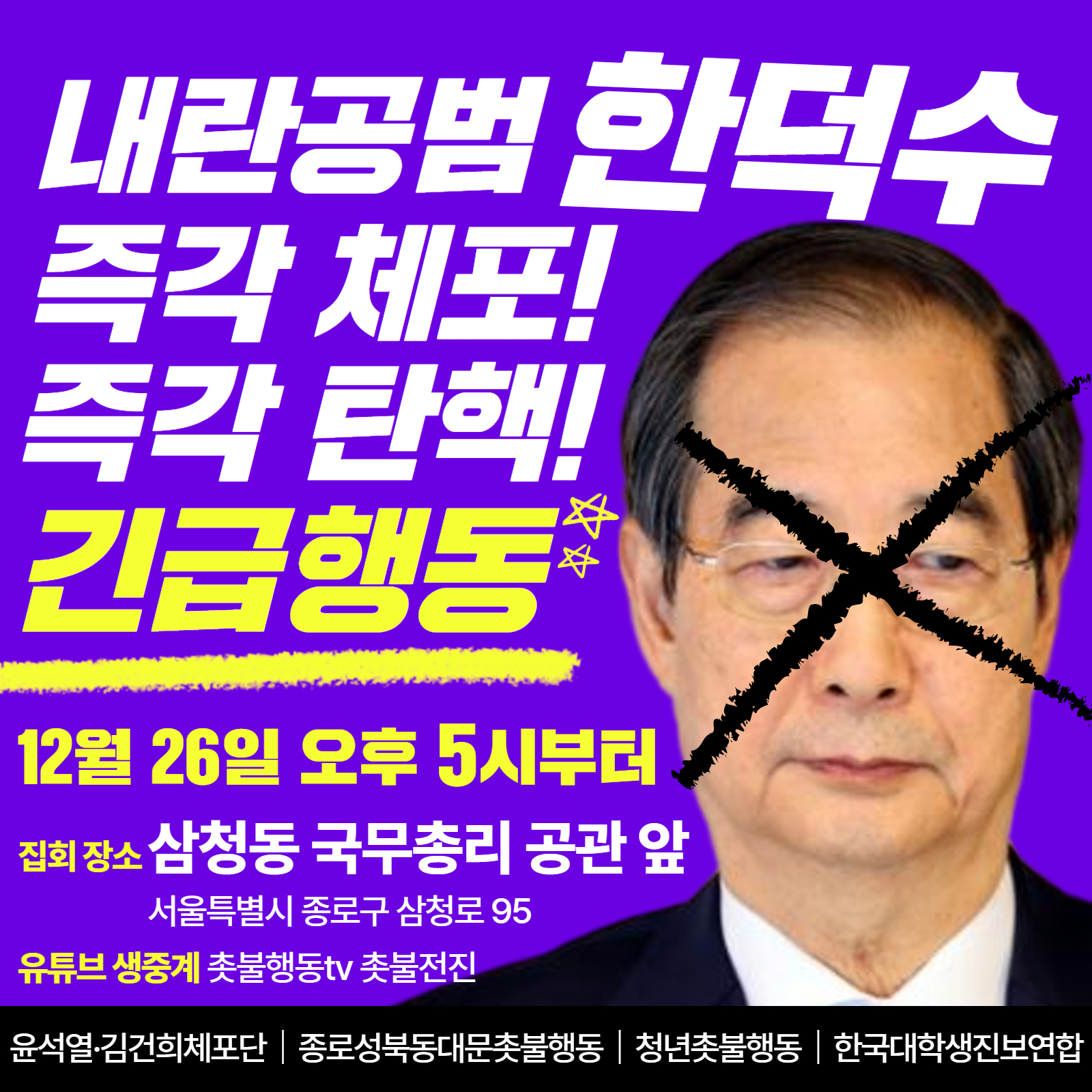 서울 종로 12월26일(목) 5시 삼청동 국무총리 공관 앞 내란공범 한덕수 측각탄핵 긴급행동