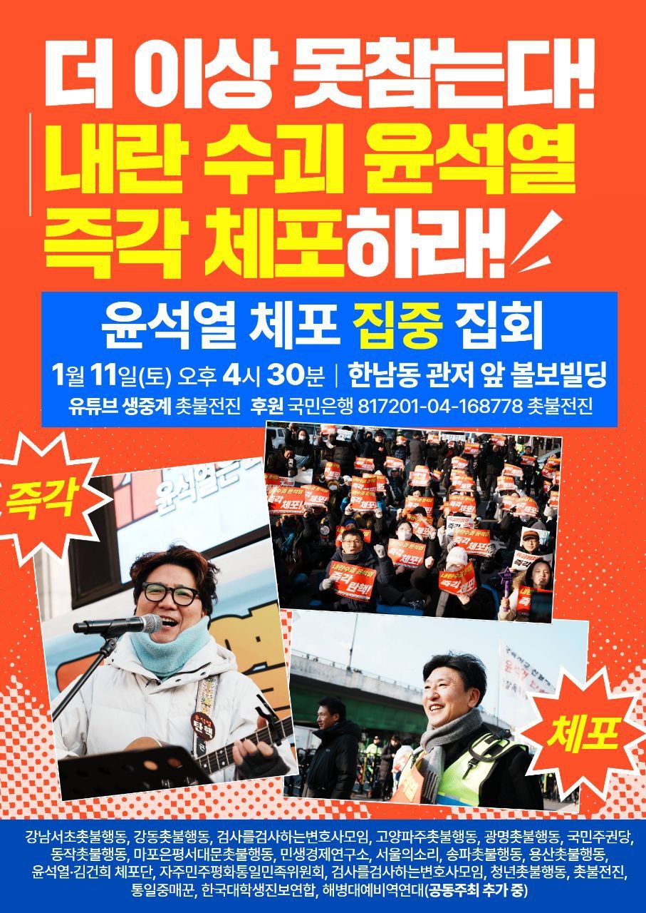 서울 용산 1월11일(토) 4시30분 한남동 관저 앞 볼보빌딩(한남대로 130) 윤석열 체포 집중 집회