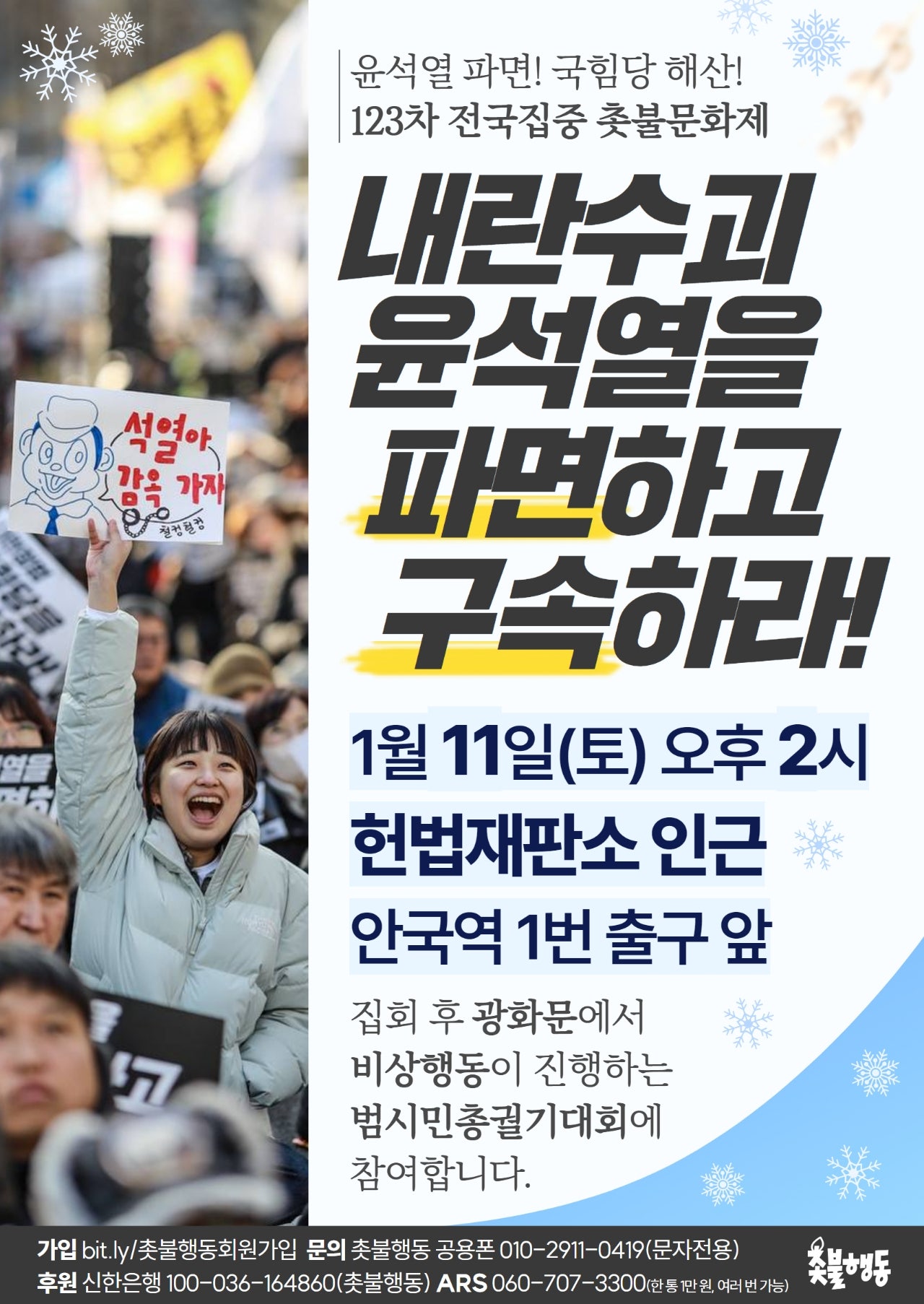 1월11일(토) 2시 헌법재판소 인근 (안국역 1번 출구) 윤석열 파면, 국힘당 해산 123차 촛불대행진 집회 일정