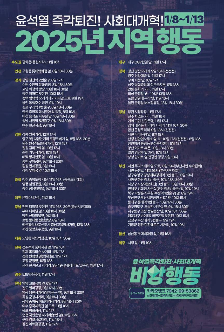 1월9일(목) 윤석열 탄핵 촛불집회 전국 일정