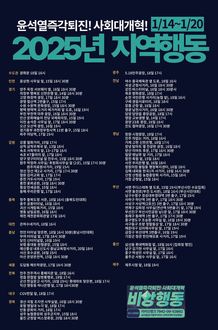 1월20일(월)-26일(일) 윤석열 탄핵 촛불집회 전국 일정 https://tadream.tistory.com/38004