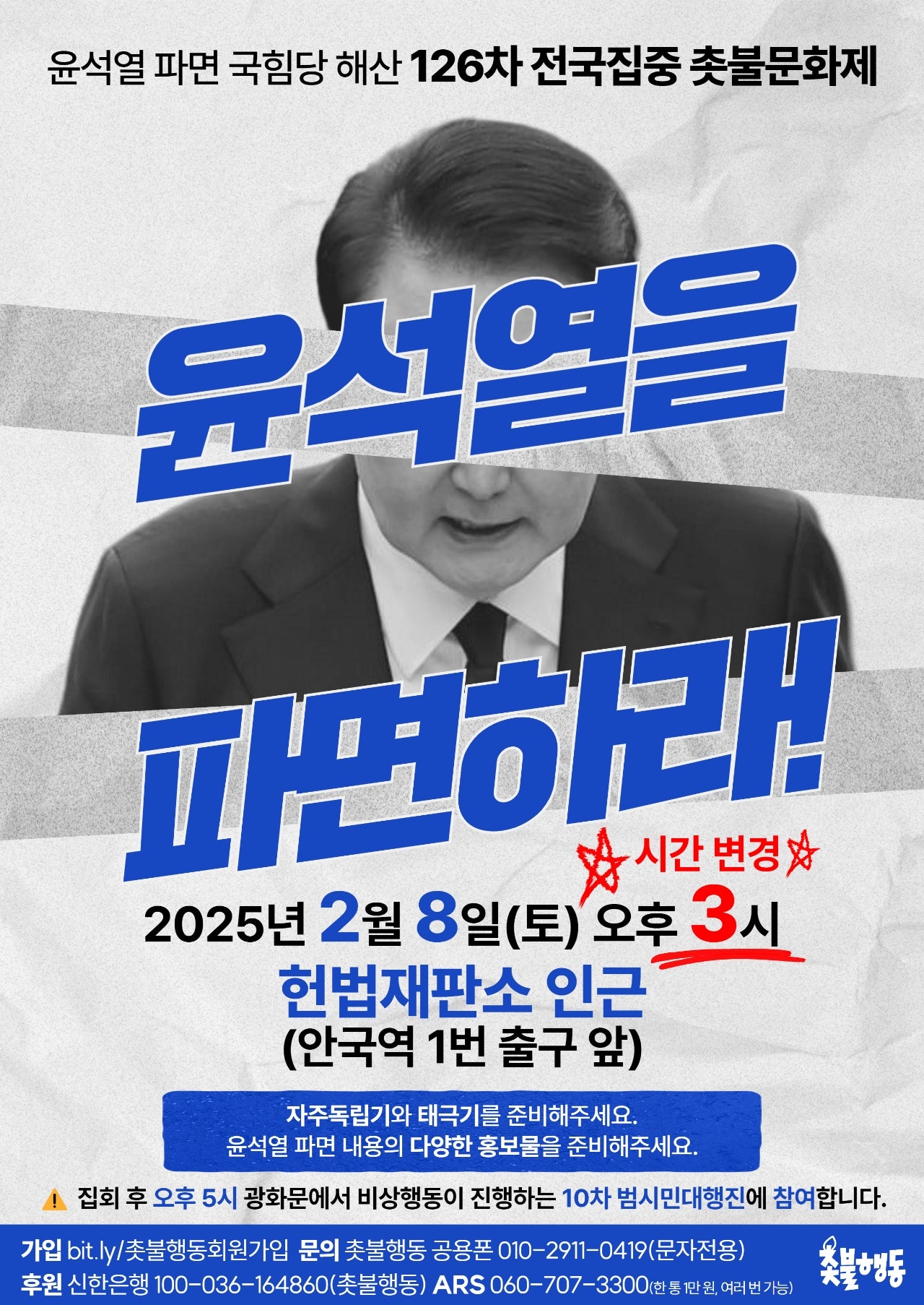 서울 2월8일(토) 3시 헌법재판소 인근 (안국역 1번 출구 앞) 윤석열 파면 126차 전국집중 촛불문화제 --> 시간 변경