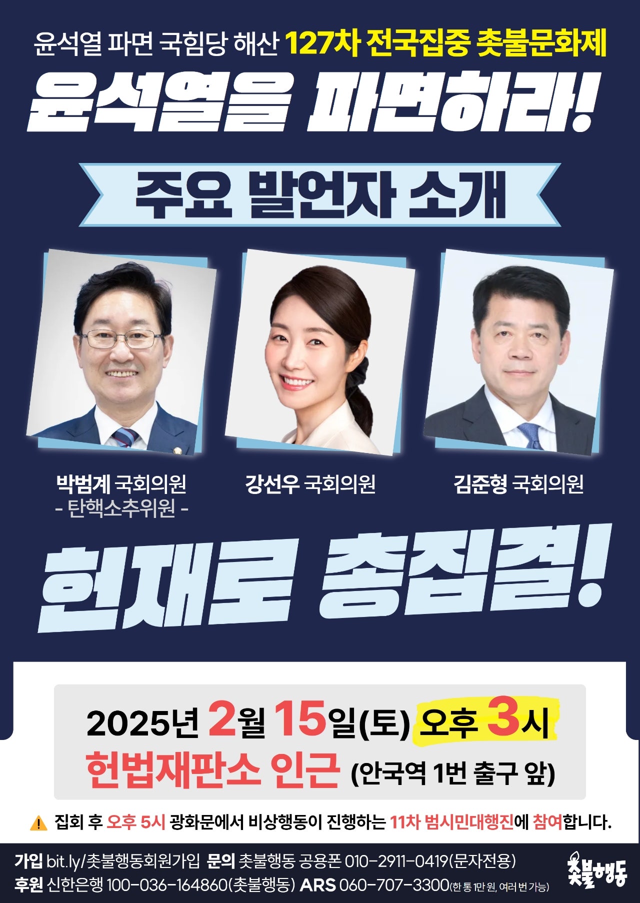 2월15일(토) 3시 헌법재판소 인근 윤석열 파면 127차 전국집중 촛불문화제 집회 일정