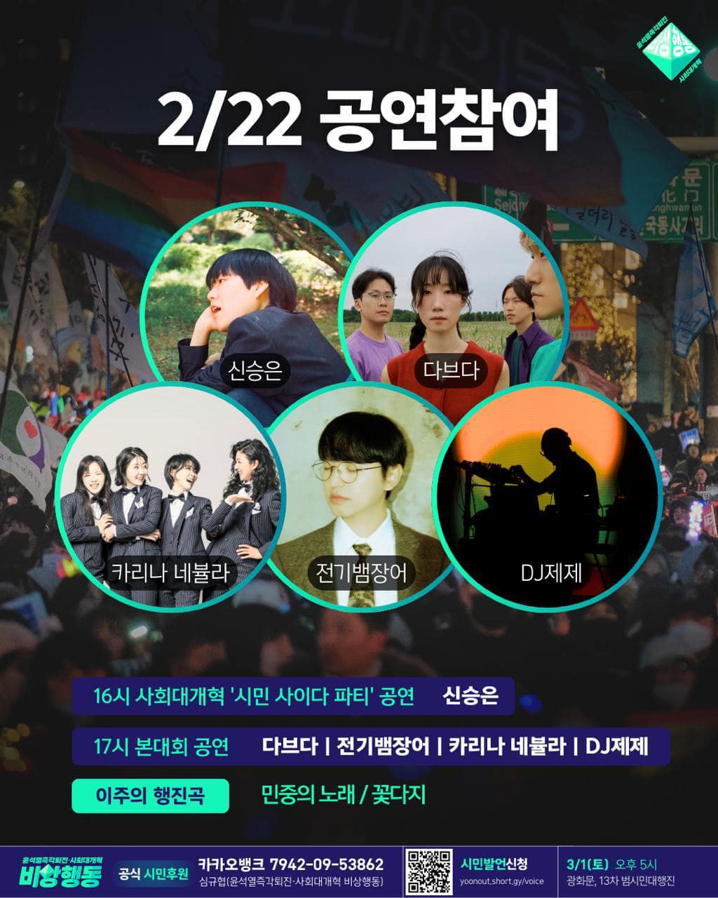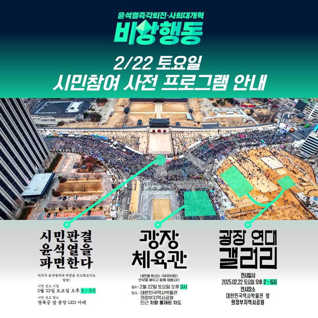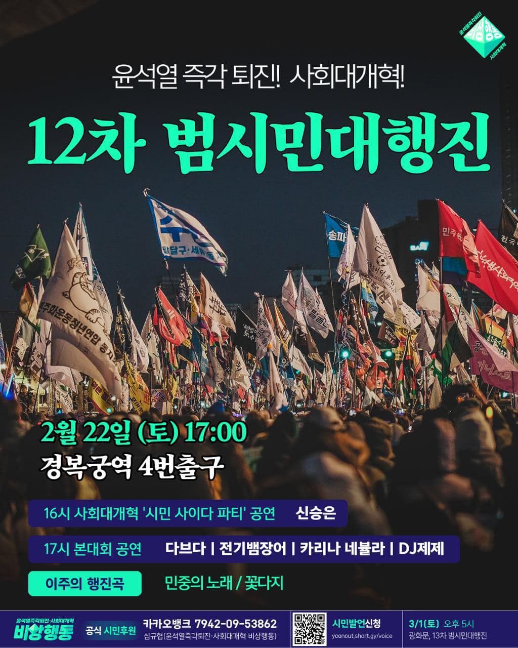 2월22일(토) 5시 광화문 윤석열 즉각 퇴진 12차 범시민대행진 집회 일정