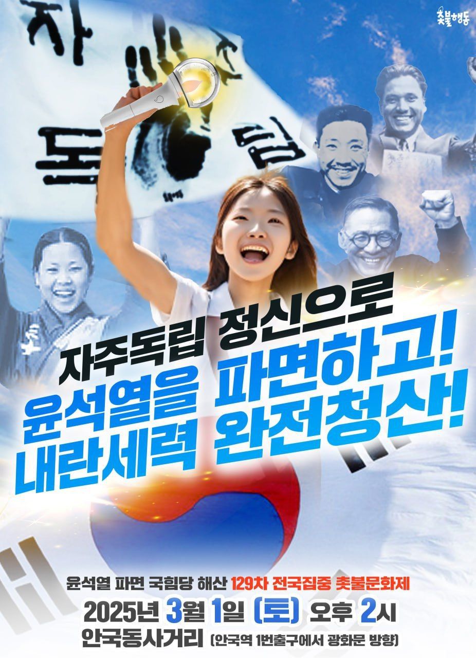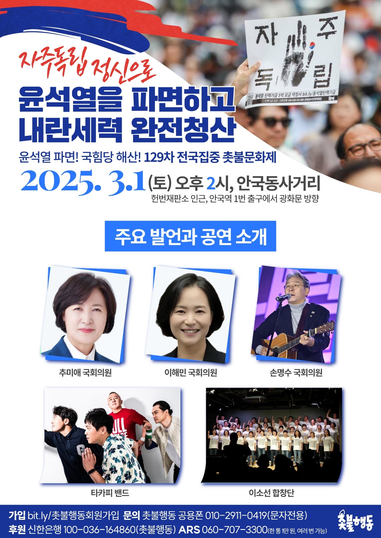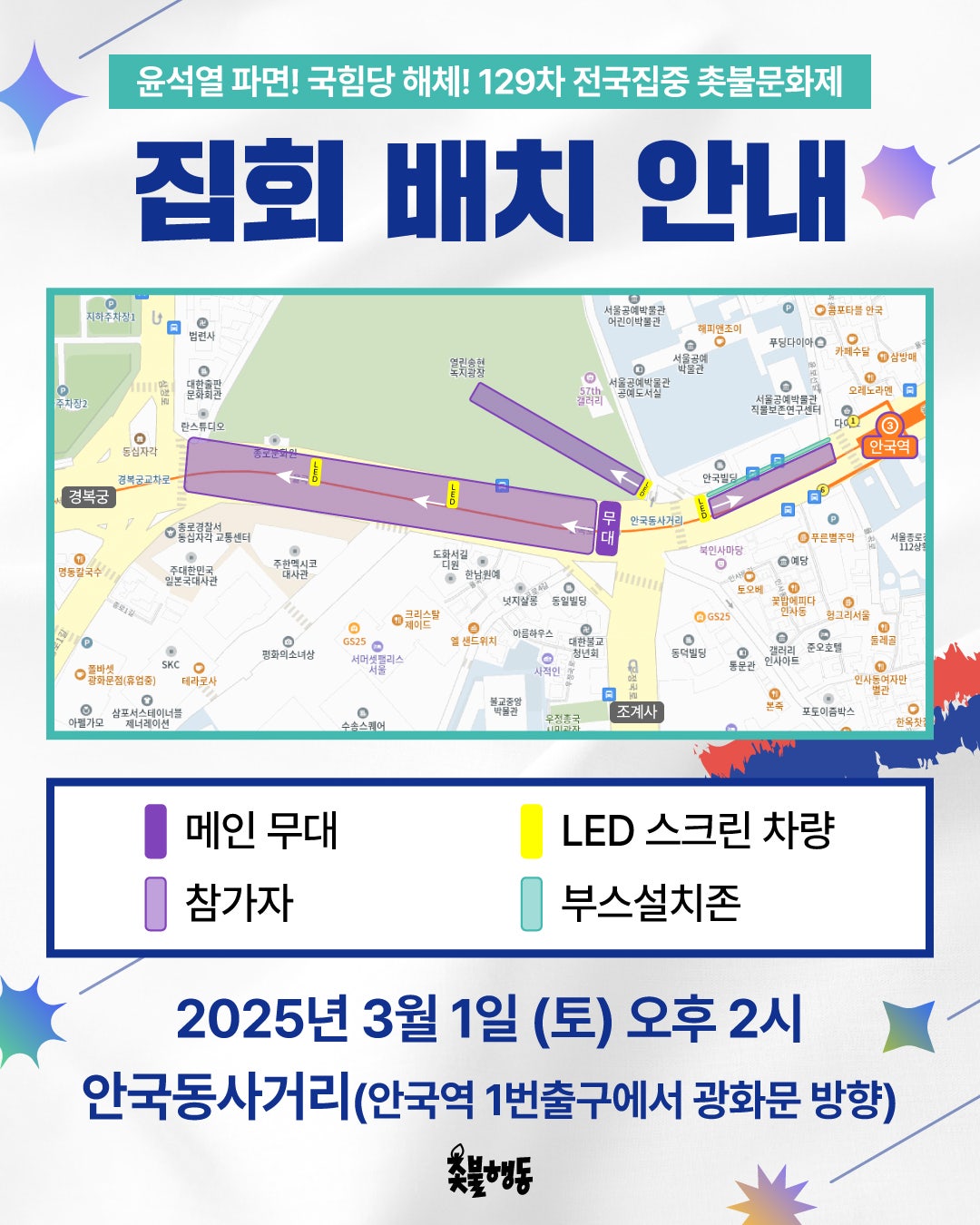3월1일(토) 2시 안국동사거리 윤석열 파면 129차 전국집중 촛불문화제 집회 일정
